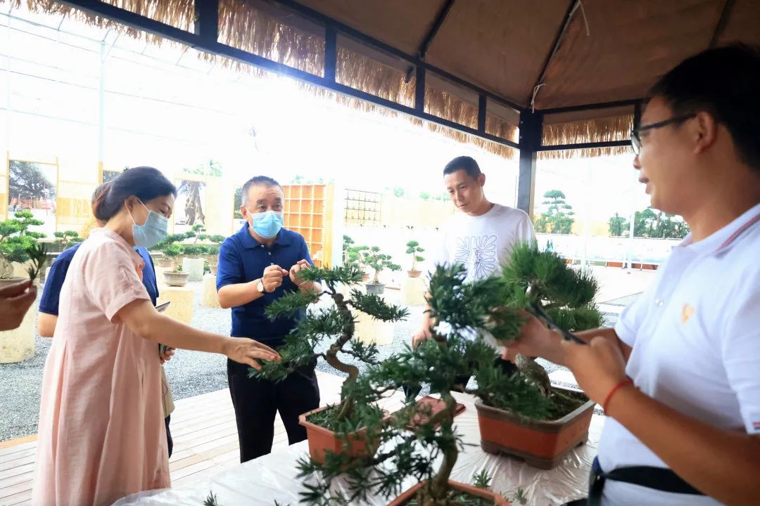 在羅漢松盆景修剪區(qū),高山主任詳細(xì)詢問造型手法和工藝,對修剪技師的技藝表示贊賞。