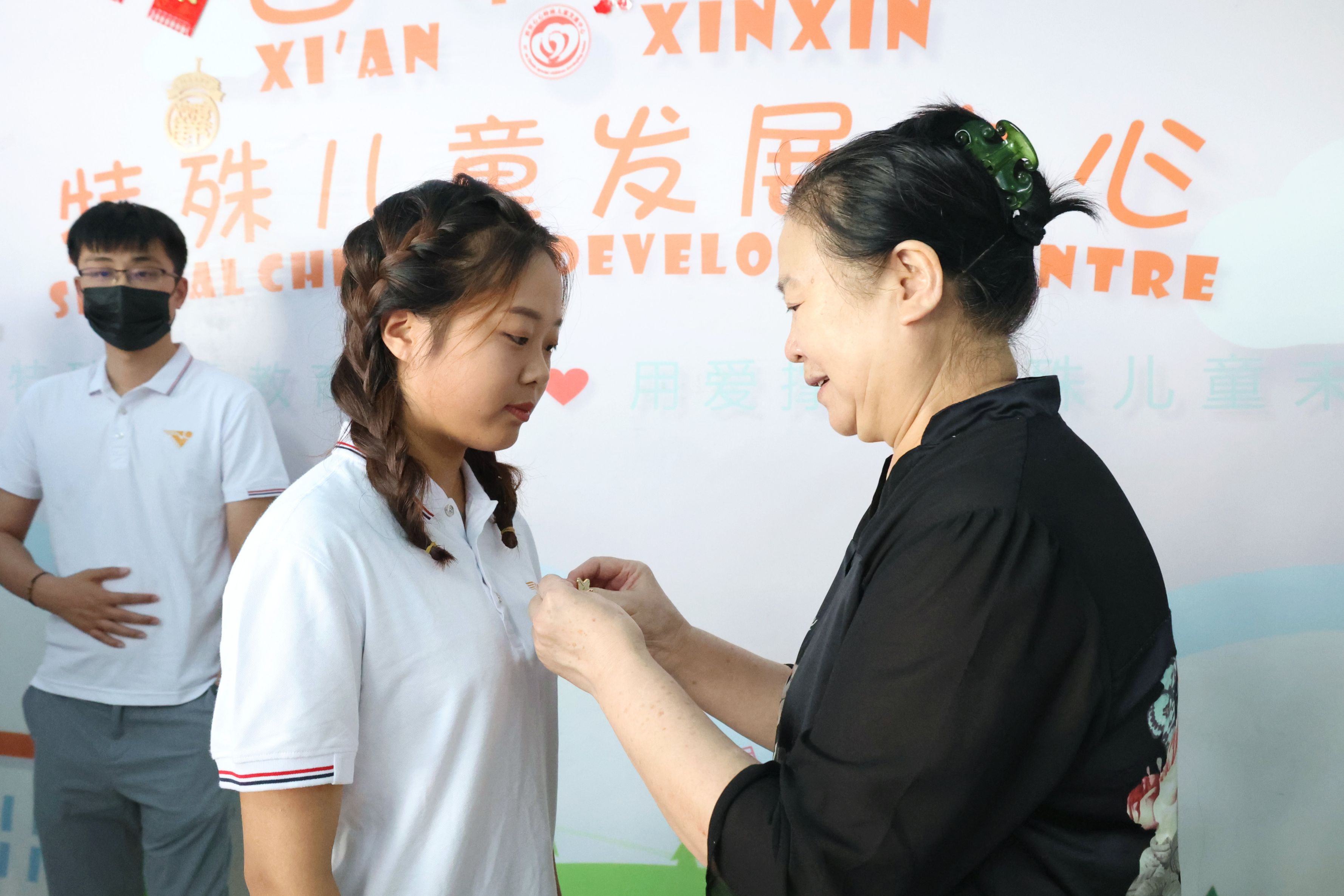 "心心”負(fù)責(zé)人張媽媽為志愿者伙伴們佩戴“公益之星”勛章,大家感受到了滿滿的榮譽(yù)感和儀式感。