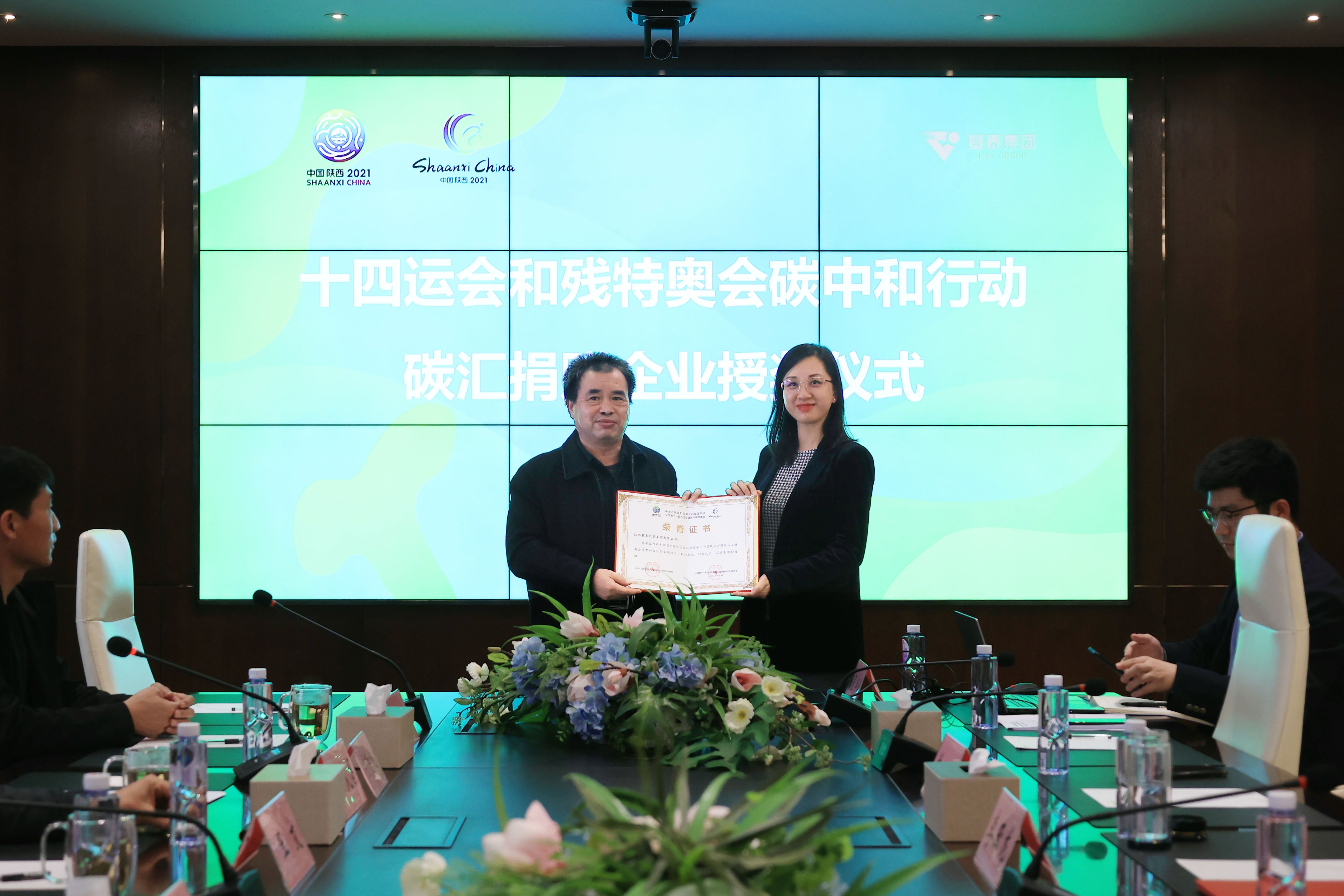 王文為基泰集團(tuán)頒發(fā)“十四運(yùn)會和殘?zhí)貖W會碳中和行動捐贈證書”。