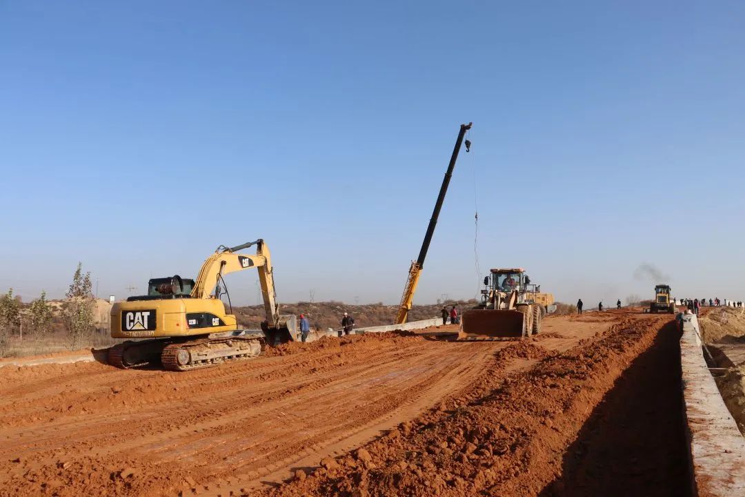 在項目建設(shè)現(xiàn)場,施工人員忙個不停,吊裝機、挖掘機、裝載車、壓路機等設(shè)備來往穿梭在工地上,機械轟鳴,工地呈現(xiàn)出一派熱火朝天的施工景象。
