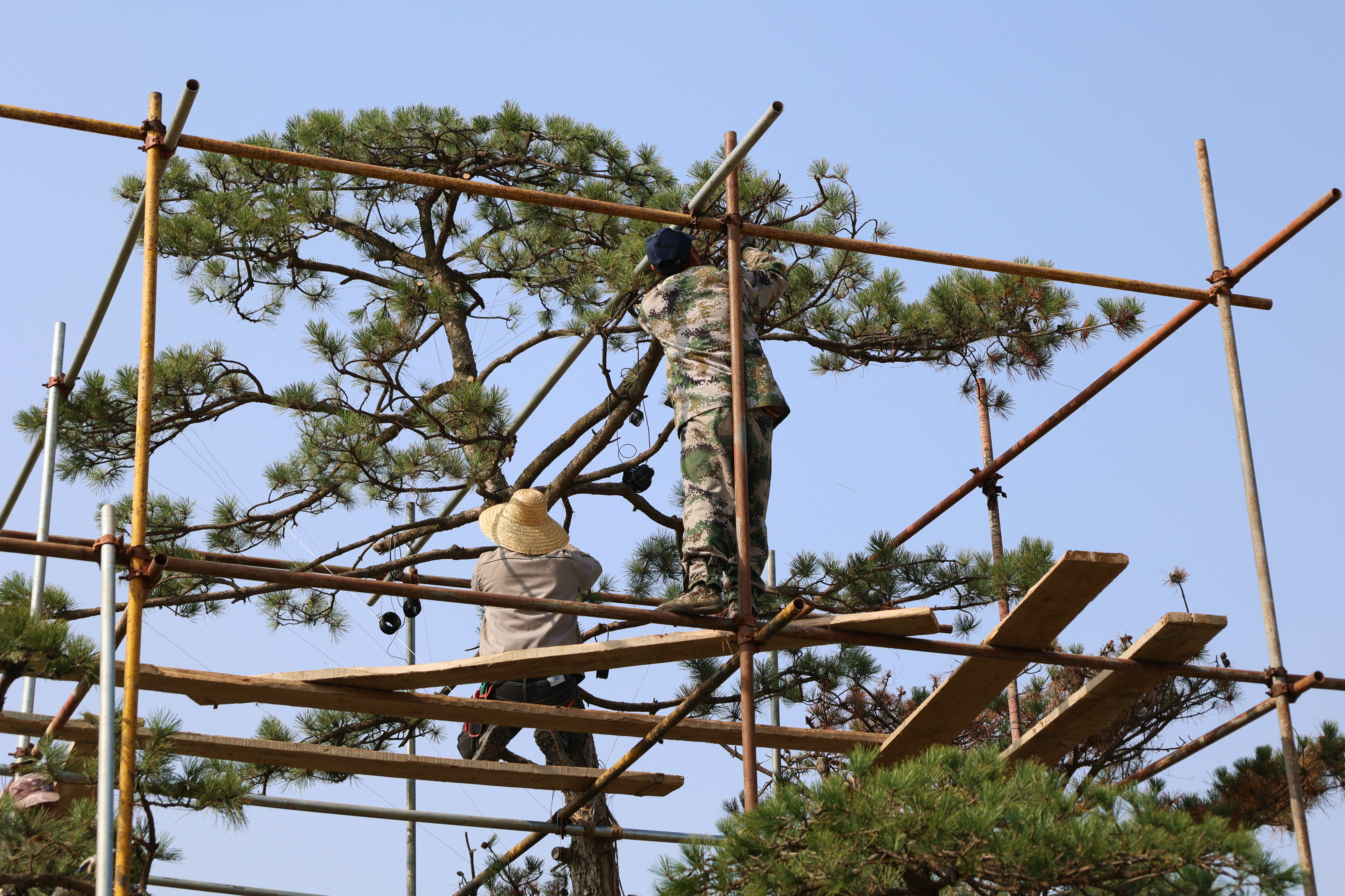 只見(jiàn)他們或爬上梯子手持刀剪精雕細(xì)琢,或蹲在地上綁扎鐵絲細(xì)心造型,一棵棵油松在他們的精致造型修剪下,干勁枝虬,形態(tài)各異,同點(diǎn)綴的景石、綠植相互映襯,別有一番韻致。