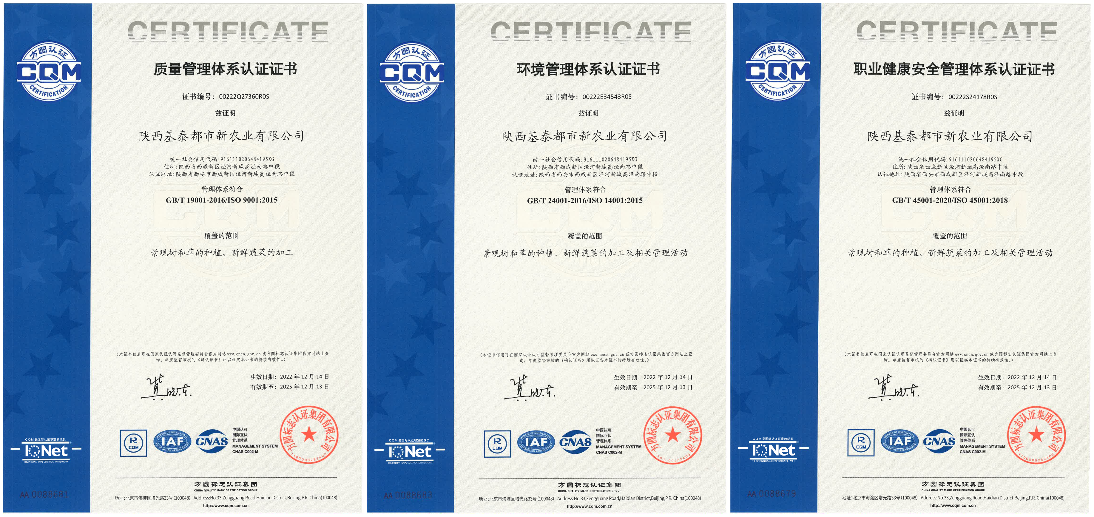 12月15日,陜西基泰都市新農(nóng)業(yè)有限公司順利通過(guò)了質(zhì)量管理體系、環(huán)境管理體系及職業(yè)健康安全管理體系認(rèn)證審核,并取得“三體系”認(rèn)證證書(shū),標(biāo)志著公司在觀(guān)賞園藝、現(xiàn)代農(nóng)業(yè)行業(yè)的規(guī)范化和標(biāo)準(zhǔn)化管理達(dá)到新的水平,于公司發(fā)展具有里程碑意義。